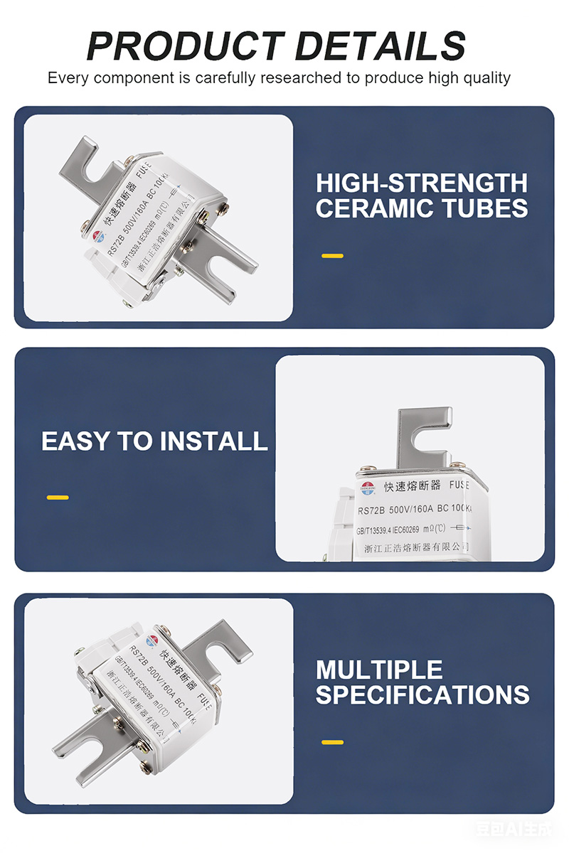 RS72B 500V 160A BC 100KA Sicherungseinsätze sind leistungsstarke Industriesicherungen, die speziell für den Hochspannungs- und Hochstromschutz entwickelt wurden. RS72B 500V 160A BC 100KA Sicherungseinsätze bestehen aus hochwertigen Materialien und verfügen über eine hervorragende Ausschaltkapazität. Es hält einem maximalen Kurzschlussstrom von 100 kA stand und verhindert so wirksam Geräteschäden.